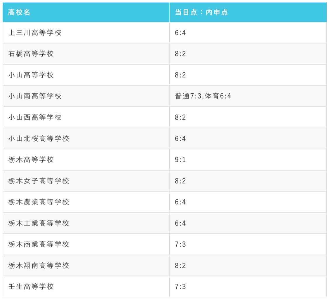 栃木県内の公立高校一般入試の場合、内申点が合否に影響を与える割合は学校によって異なります。以下は栃木県内の公立高校と、合否判定における入試の点数と調査書の点数の割合を示したものです。なお、高校の数の関係上、旧学区に分けて全日制のみ記載しています。