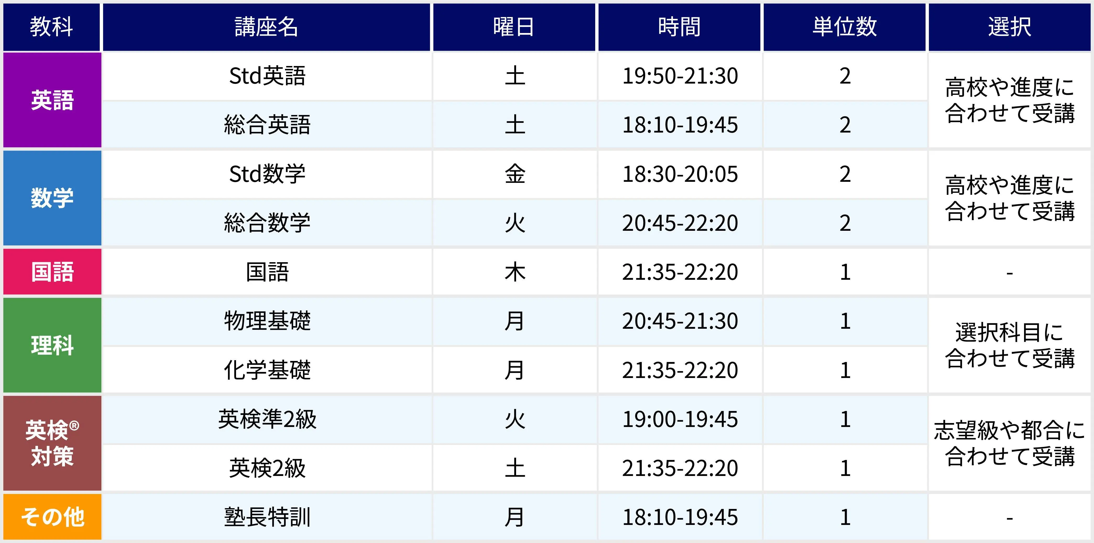 教師は全員正社員です。学校の進度に沿っているので、大学受験で指定校推薦・公募推薦他 各種推薦入試を利用したい人、学校の通知表を上げたい人にピッタリです。他にもハイレベルな内容を扱うクラスや、基礎学力向上の為のクラスなどレベル別に設定しています。